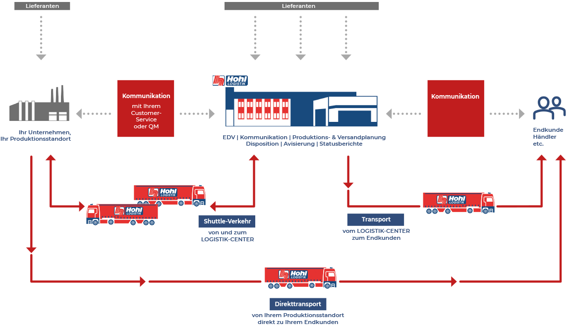 Das HOHL LOGISTIK-CENTER ermöglicht es Ihnen, alle Distributionsaufgaben auszulagern. Dabei greifen wir bei HOHL noch tiefer in die Produktionsprozesse des Kunden ein. Unsere Distributionslogisitik umfasst die Gestaltung, Steuerung und Kontrolle wichtiger Prozesse, die nötig sind, um letztendlich die Produkte unseres Kunden zu transportieren.